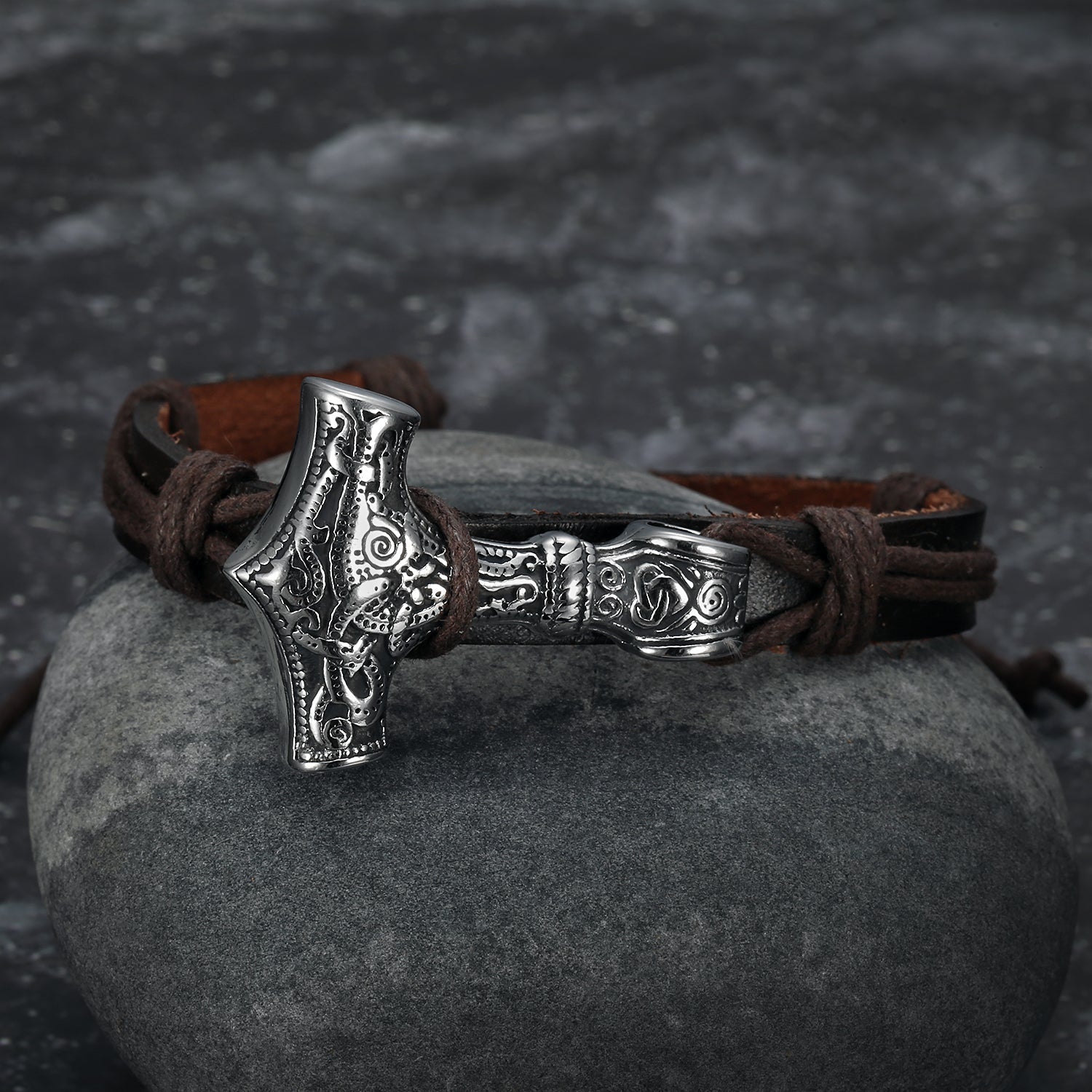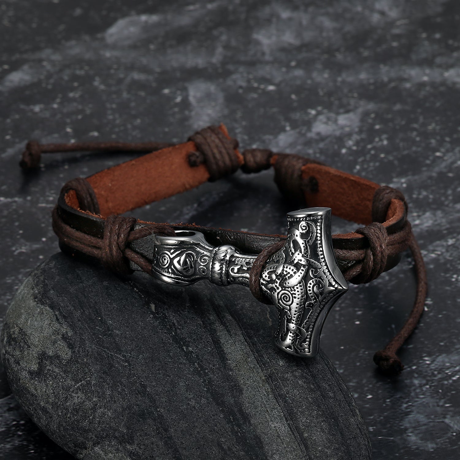 Bjorn Regalia Adjustable Leather Wristband With Handcrafted Stainless Steel Mjolnir