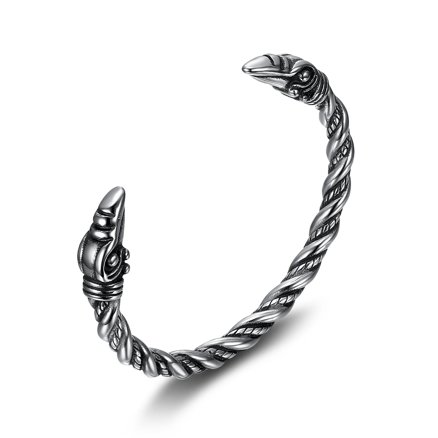 Bjorn Regalia Handcrafted Stainless Steel Beaded Spiral Raven Head Torc Bracelet