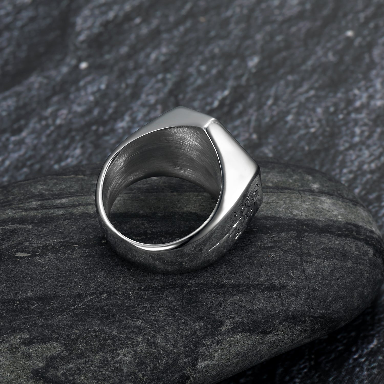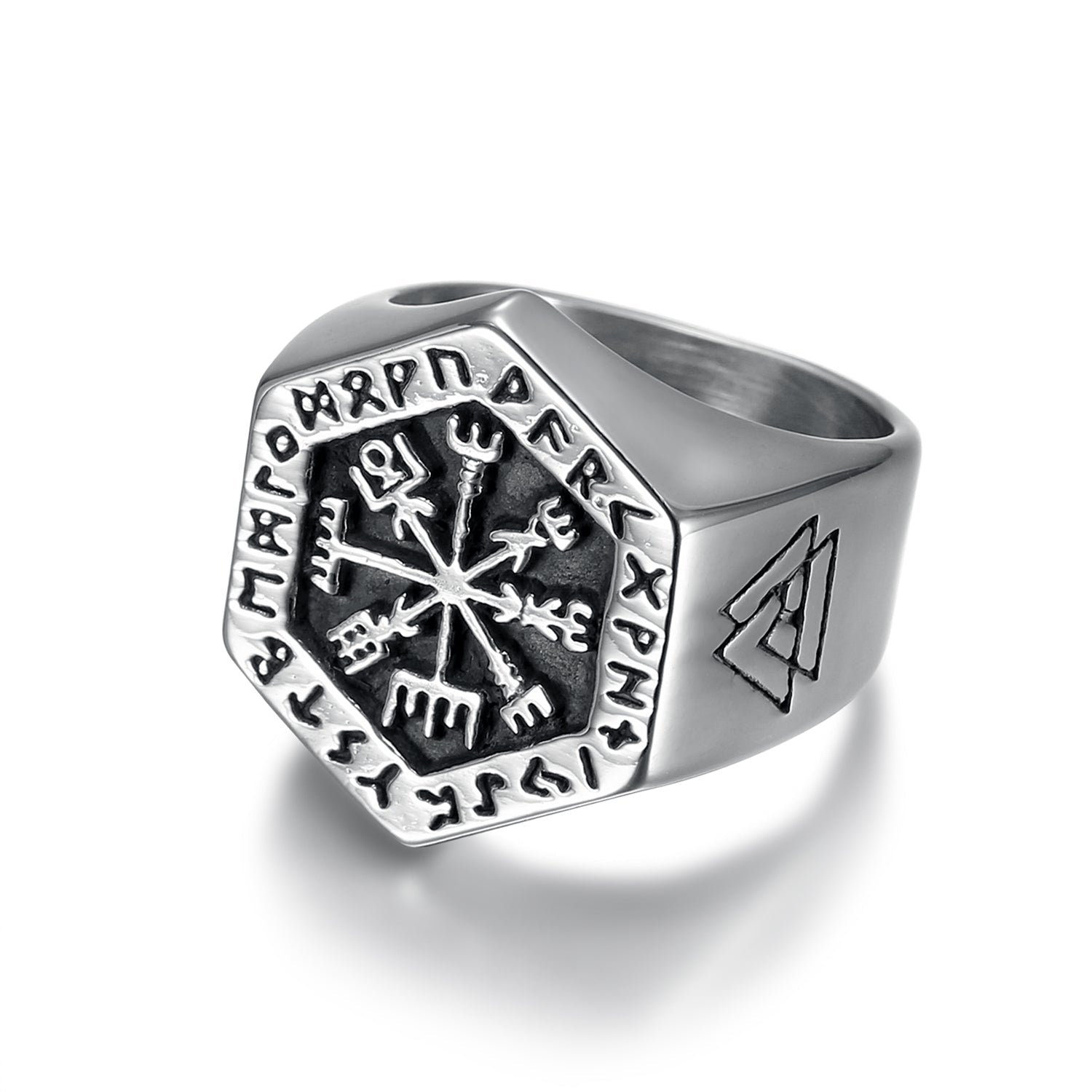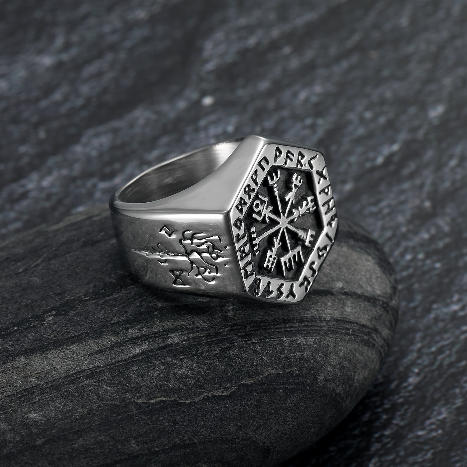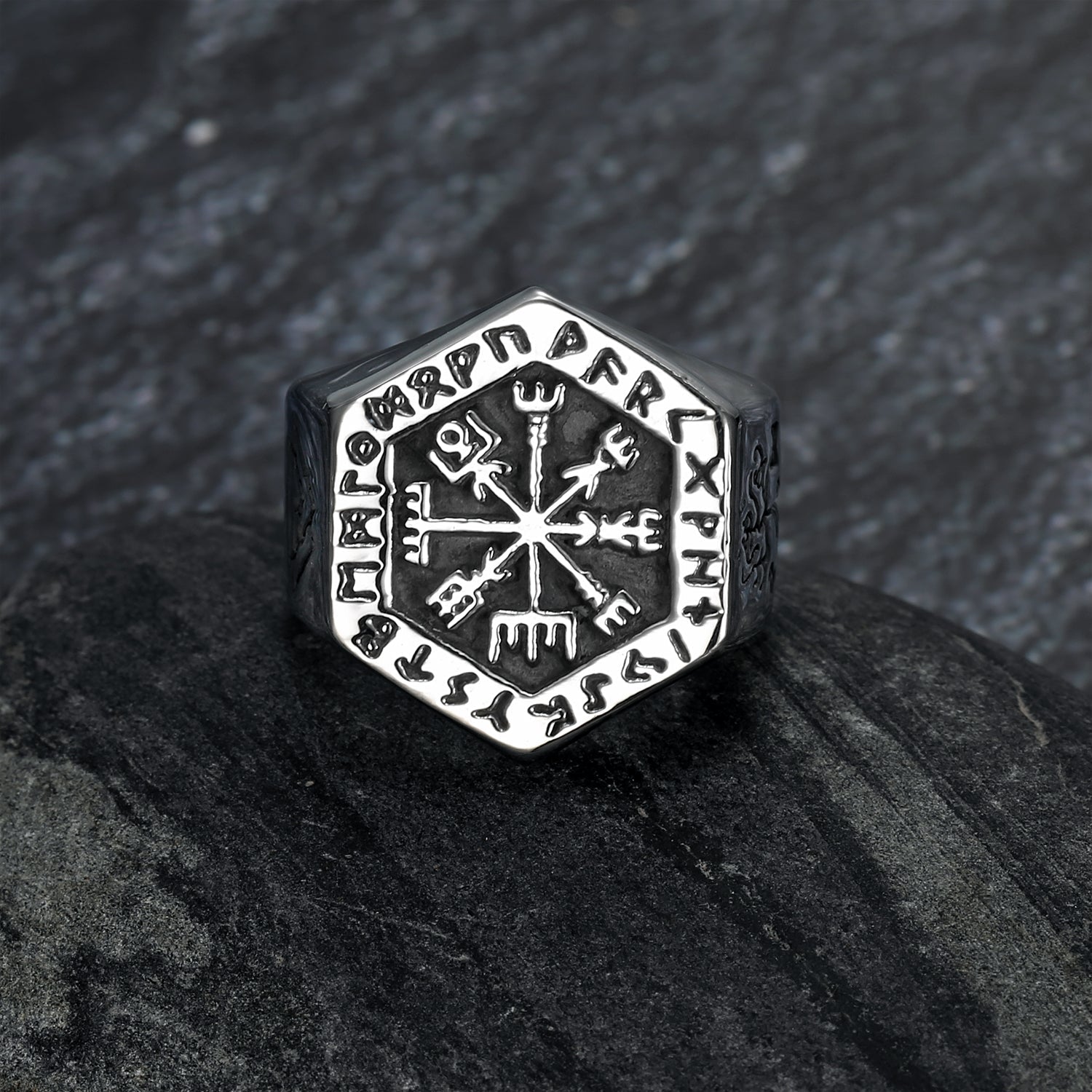 Bjorn Regalia Handcrafted Stainless Steel Hexagonal Vegvisir & Valknut Rune Ring