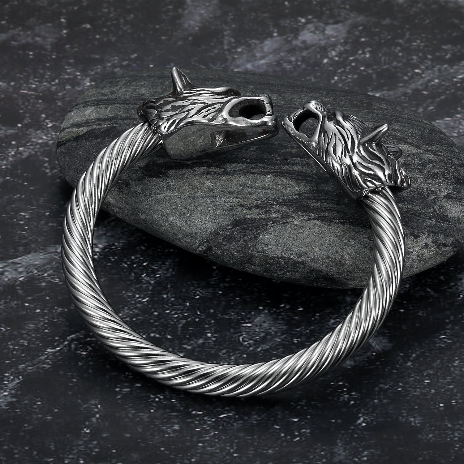 Bjorn Regalia Handcrafted Stainless Steel Large Wolf Head Torc Bracelet