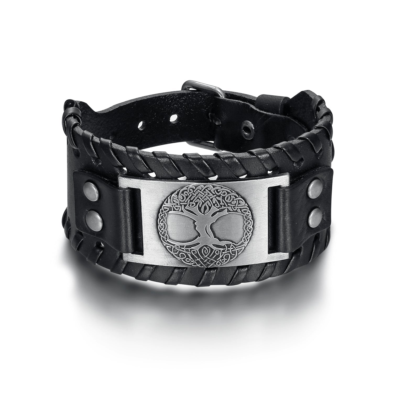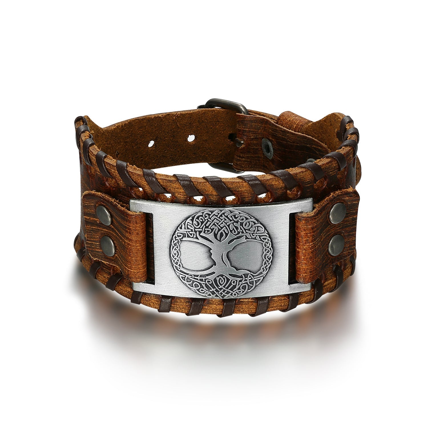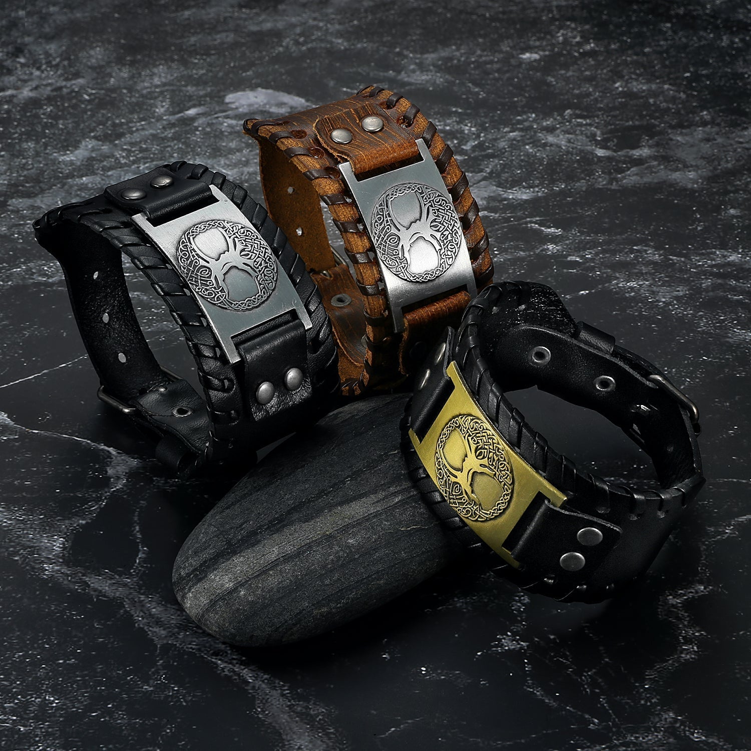Bjorn Regalia Leather Buckle Arm Cuff With Metal Tree of Life / Yggdrasil Design